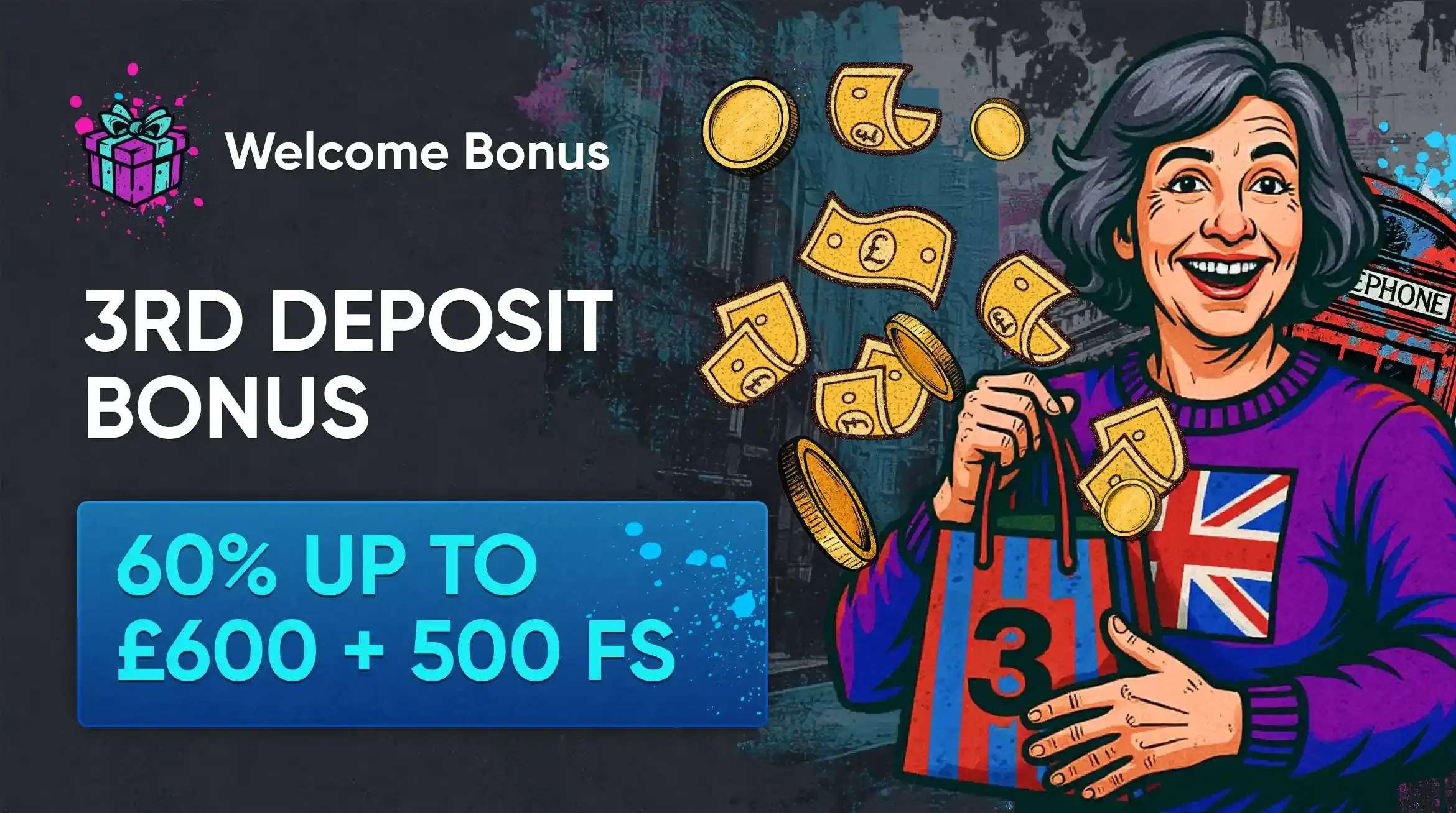 | Welcome — 3rd deposit | 60% up to £600 + 500 FS | HAMPSTE |